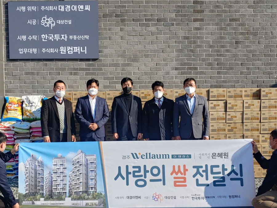 이번 기부물품은 아파트 모델하우스 개관식에서 축하 화환 대신 받은 쌀 540kg과 대상건설에서 준비한 종가집 쌀국수 200박스로 복지시설 '은혜원'에 기증하였다.